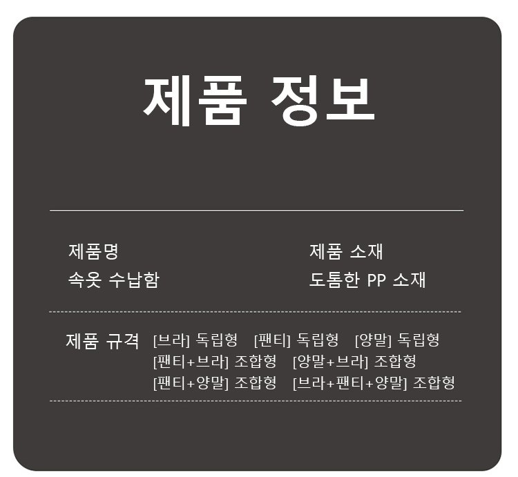 제품 사양 : [브라] 독립 포장, [팬티] 독립 포장, [속옷] 독립 포장, [팬티+속옷] 조합 포장, [양말+속옷] 조합 포장, [팬티+양말] 조합 포장, [브라, 팬티, 속옷] 조합 포장